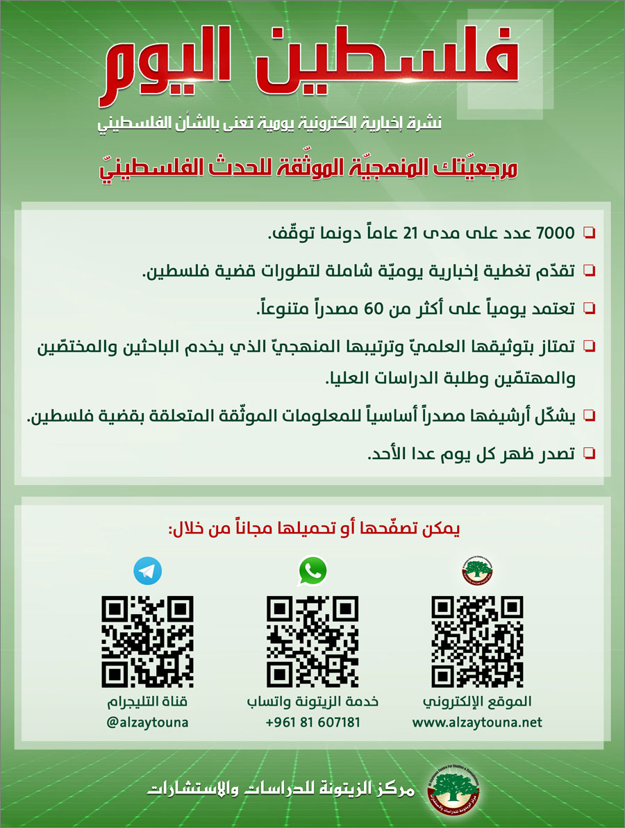 يسر مركز الزيتونة أن يوفر للقارئ الكريم رسماً توضيحياً (إنفوجراف) حول ”نشرة فلسطين اليوم … نشرة إخبارية إلكترونية يومية تعنى بالشأن الفلسطيني“.