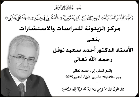 ببالغ الحزن والأسى، وبمزيد من الرضا بقضاء الله عز وجل وقدره، ينعى مركز الزيتونة للدراسات والاستشارات: الأستاذ الدكتور أحمد سعيد نوفل كان الراحل مواكباً لمسيرة المركز منذ تأسيسه، ومهتماً بنشاط المركز [...]